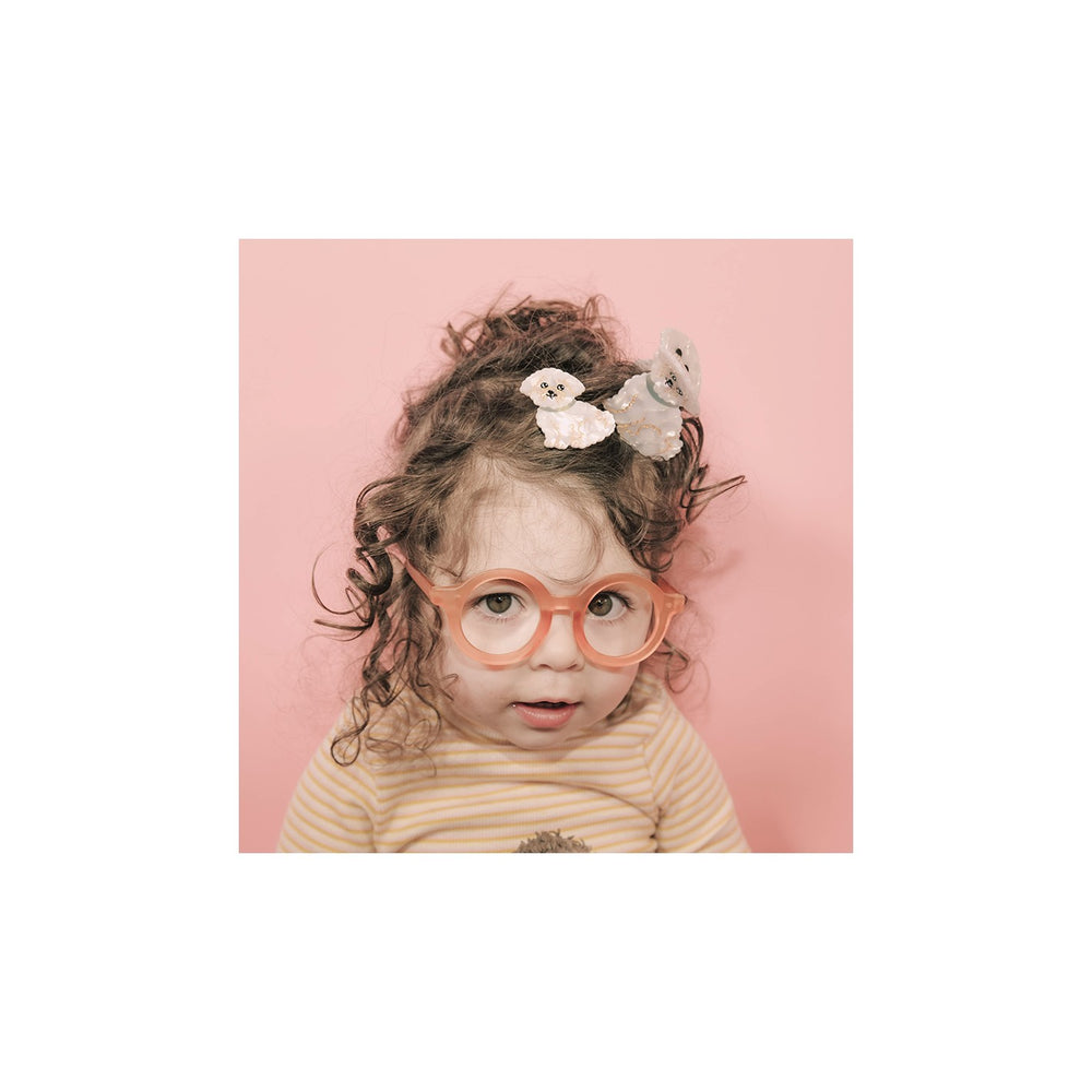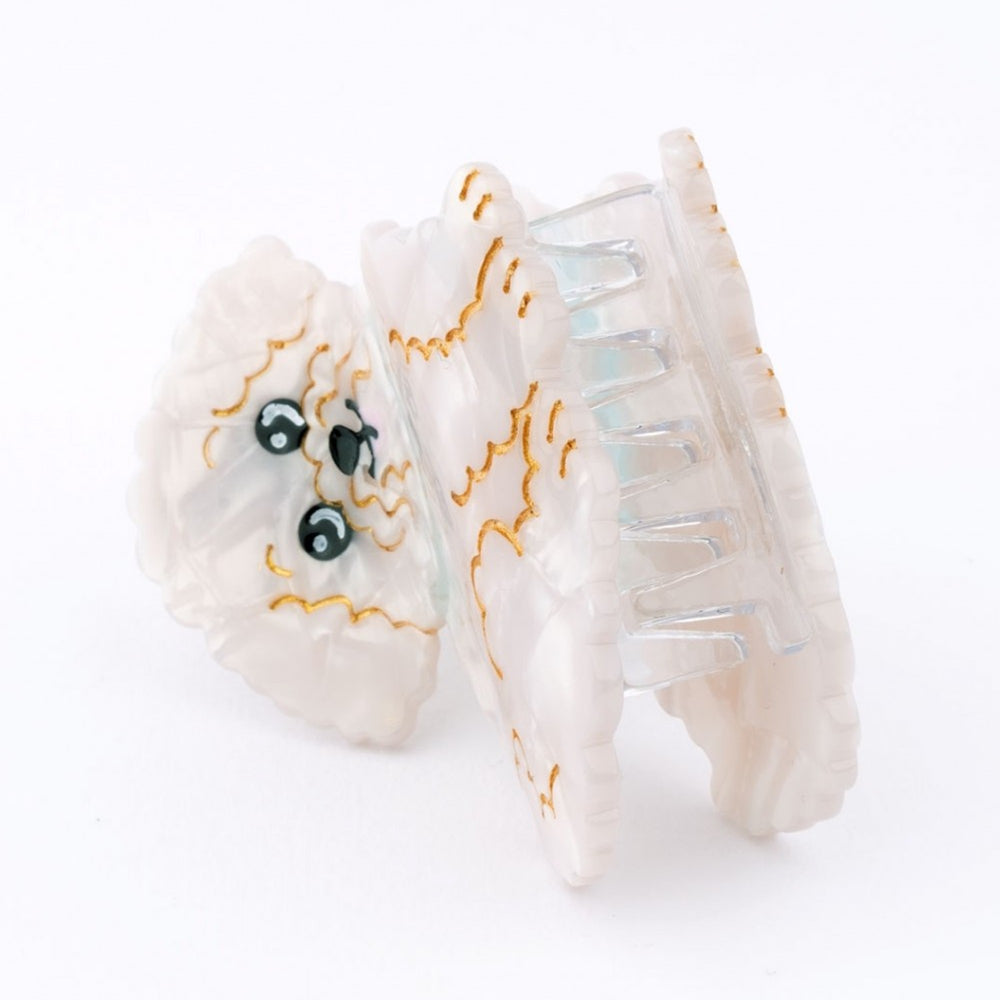 A hair clip in the shape of an adorable, curly Bichon. With its dreamy eyes, turquoise collar, and gold details, this dog will keep any hairstyle company, from messy buns to neat ponytails.