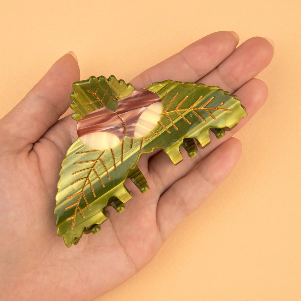 Materijal: celulozni acetat, metalna aligator kopča. Dimenzije: 4,5 × 3,5 cm. Boja se može neznatno razlikovati ovisno o korištenom komadu acetata.