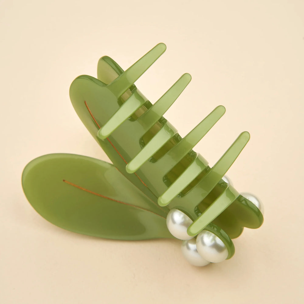 Materijal: celulozni acetat, metalna aligator kopča. Dimenzije: 4,5 × 3,5 cm. Boja se može neznatno razlikovati ovisno o korištenom komadu acetata.
