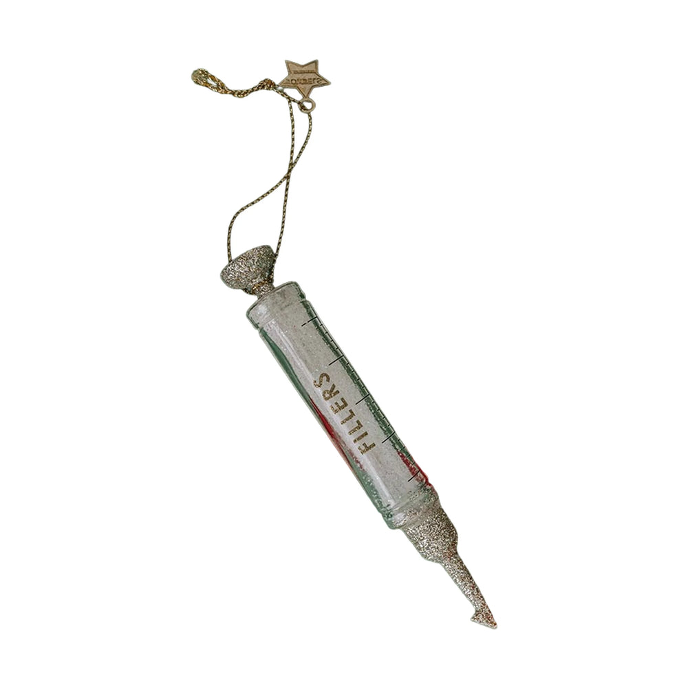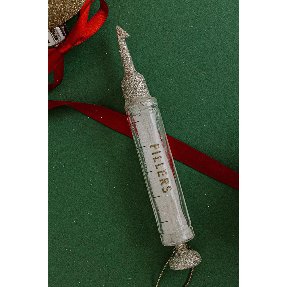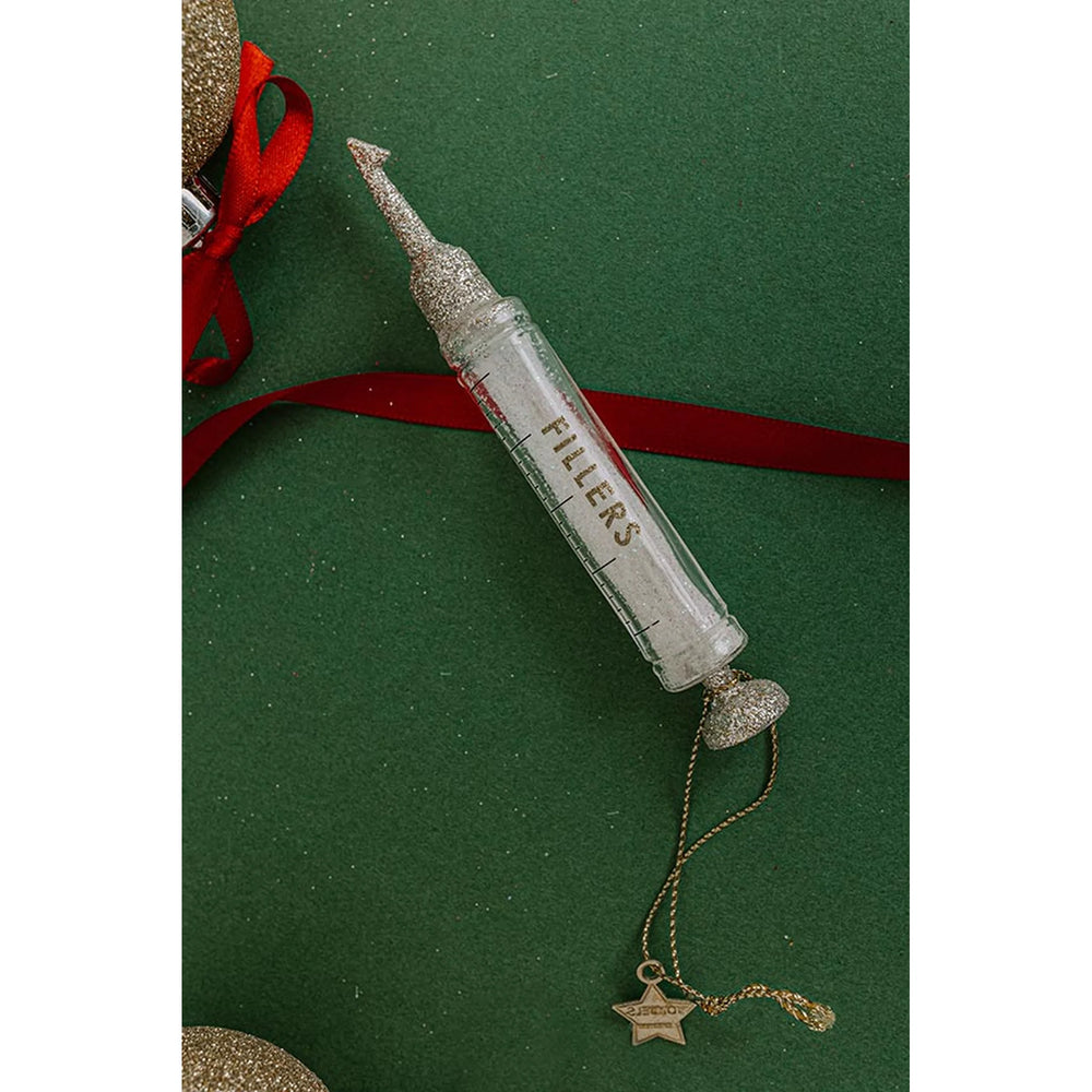 Božićni ukras u obliku injekcije koji unosi humor i glamur na božićno drvce. Prozirno staklo, srebrni glitter detalji i punjenje bijelim blistavim šljokicama čine ga upečatljivim dodatkom svakom blagdanskom dekoru.