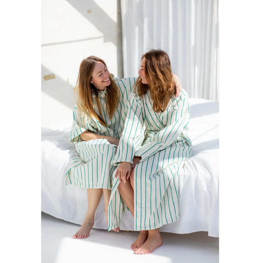 Uniseks kućni ogrtač izrađen od 100% organskog pamuka s OEKO-TEX® Made in Green certifikatom. Klasičan kroj s pojasom, šalom-ovratnikom i velikim džepovima pruža vrhunsku udobnost i mekoću.