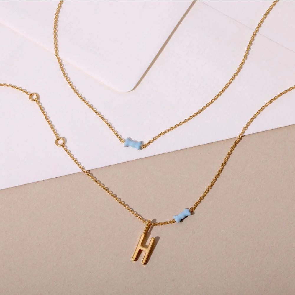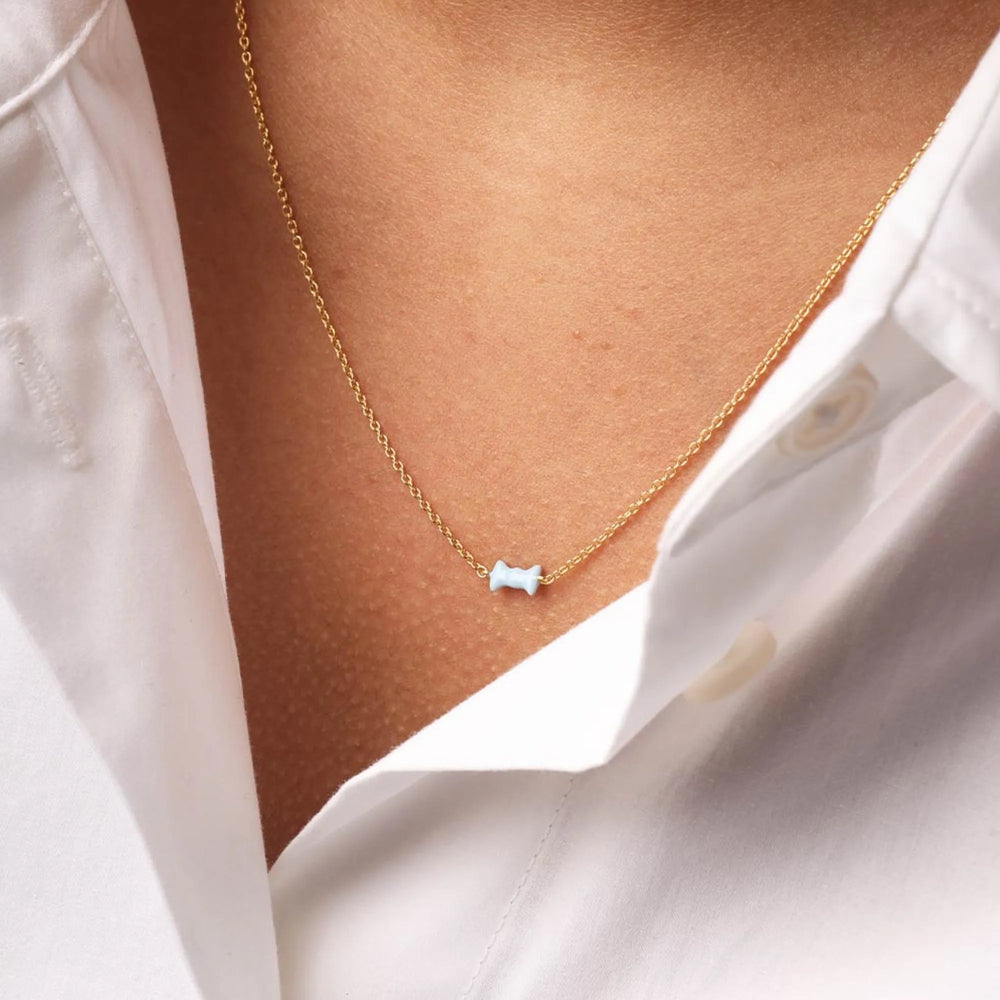 Minimalistička ogrlica s detaljem svijetloplave mašnice koja odiše ženstvenošću. Dio kolekcije Little Bowtie koja uključuje ogrlicu, naušnice, narukvicu i prsten. Savršena za kombiniranje s ostalim komadima iz kolekcije ili kao elegantan samostalan dodatak. Idealan poklon za prijateljstvo, Valentinovo, rođendan, krizmu ili Majčin dan.