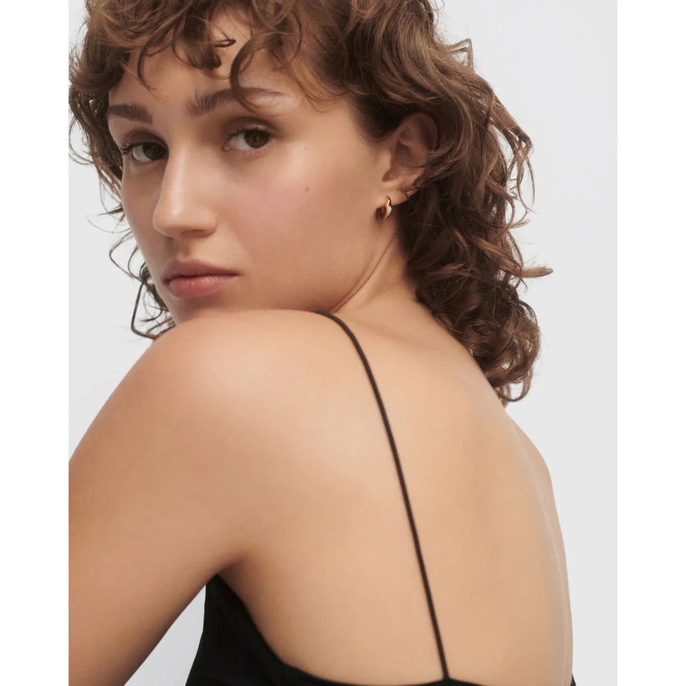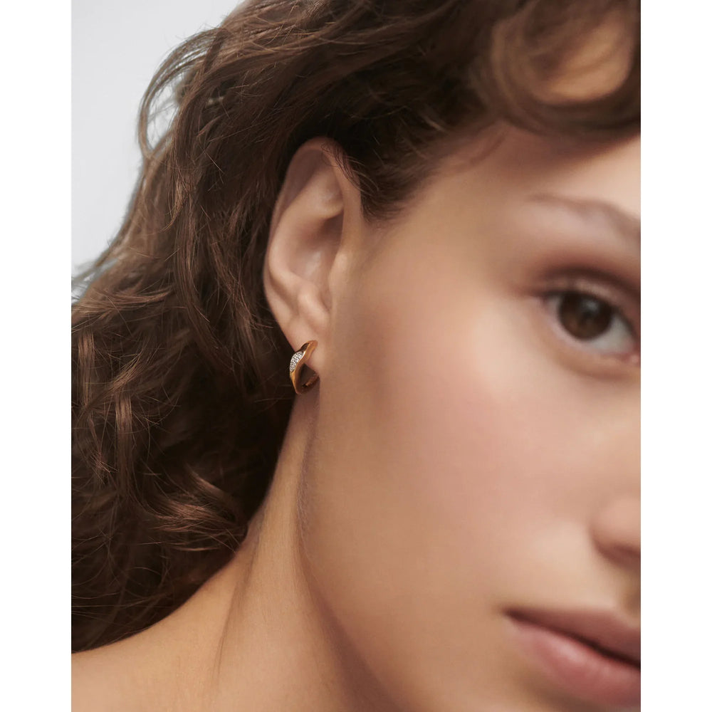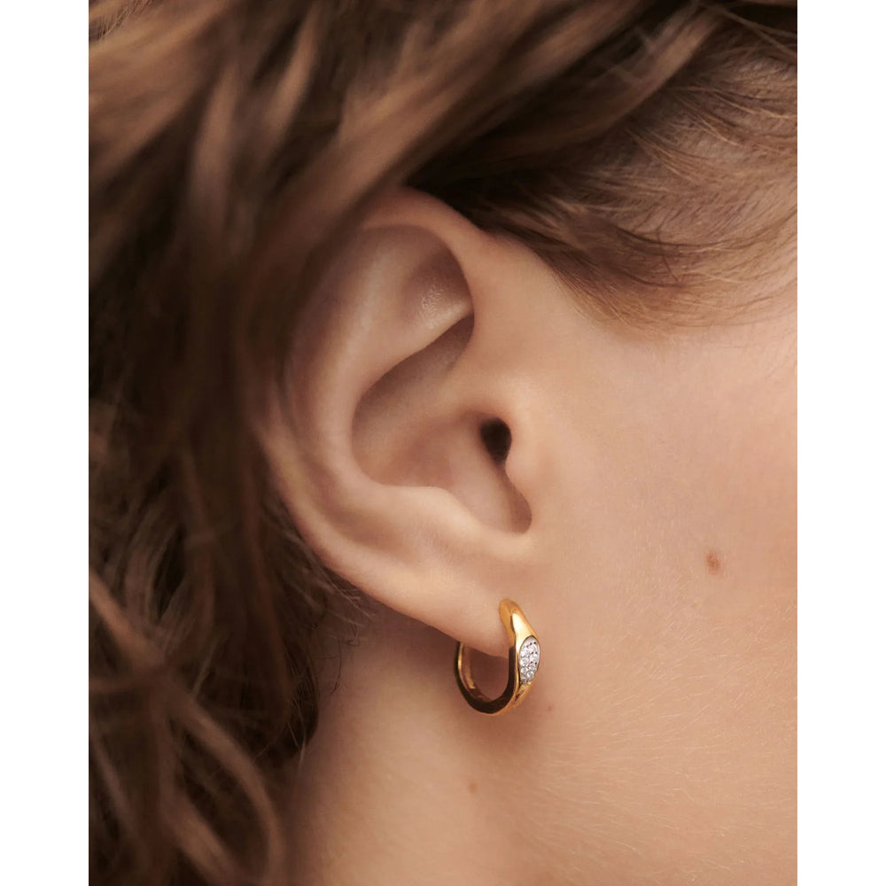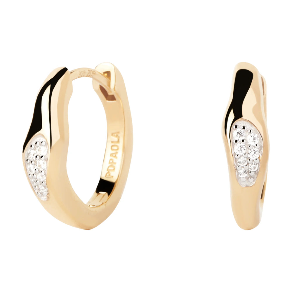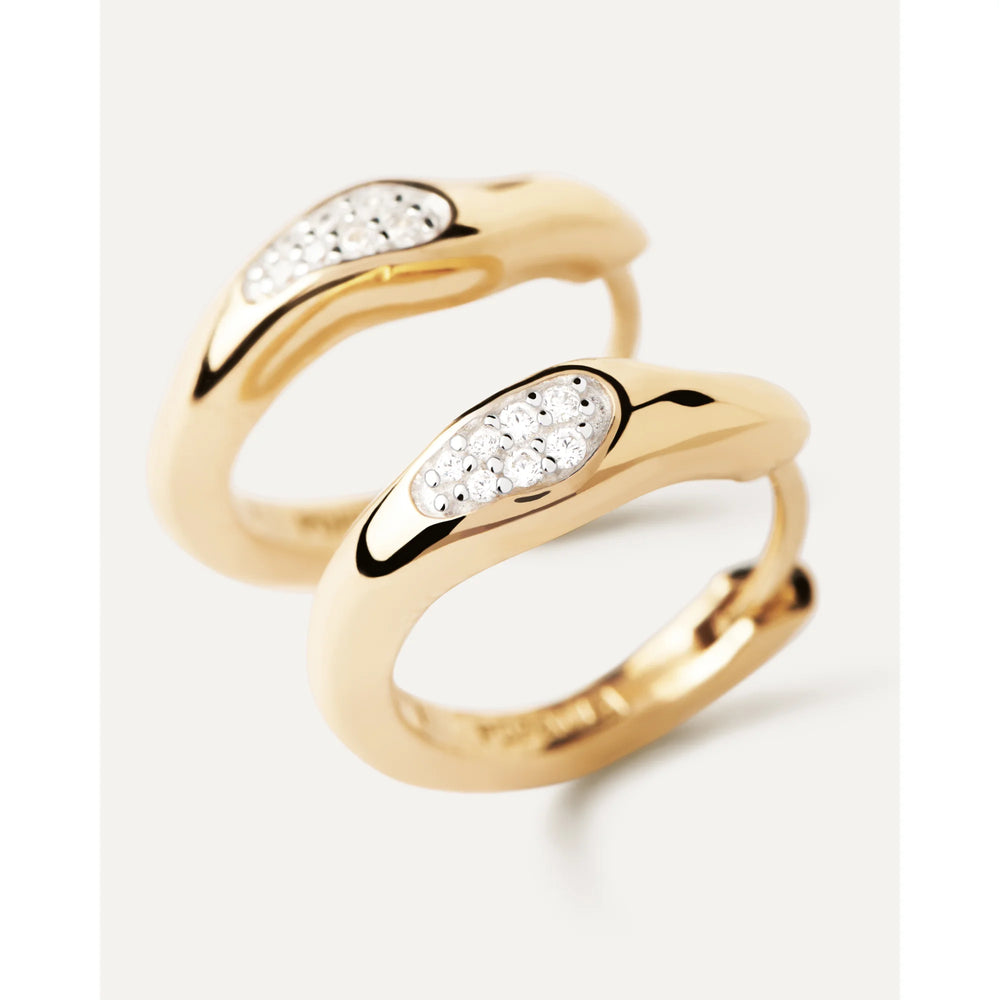 Završna obrada: pozlata od 18k zlata. Materijal: srebro (925). Kamenčići: bijeli cirkoni. Vanjski promjer obruča: 12.8 mm. Unutarnji promjer obruča: 10 mm. Debljina: 3.65 mm. Težina: 2.23 g.